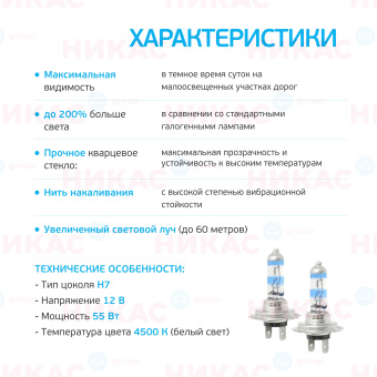 Мощность 55W Цоколь H7 Температура свечения 4500 Страна Китай Напряжение 12V -